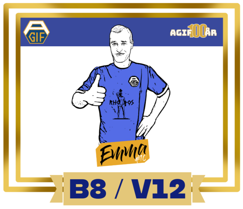 Allerums GIFs eviga 29-åring. Trotjänare sedan 1987. 446 A-lagsmatcher, 170 mål (so far!) – och säkert något nickmål han fortfarande tjatar om. Alltid på plats. Alltid ett leende. Alltid hans förtjänst vid vinst, aldrig vid förlust - Alltid Emma.En levande legend, nu förevigad på tyg när klubben fyller 100. Den här T-shirten finns bara under en begränsad tid – om inte Emma själv insisterar förstås (vilket han har gjort).